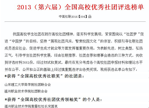 据悉,本次全国高校优秀社团评选活动由中国高校社团网主办,评选采用网络报名的方式,历时4个多月,截至3月26日共收到3661份,经过初试和复试,最终在公平、公开和公正的基础上经过慎重甄选评出各类奖项。