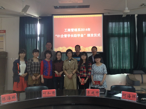 4月29日,在我院实训4号楼506室,工商系举办"01企管学长助学金"资助活动。2001级企管专业校友代表叶和倩,系党总支书记李建中、原班主任何海怀、学工办主任林香港、企管专业现任各班主任及受资助学生参与活动。