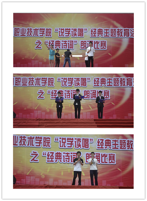 5月28日下午,由院团委主办、建工系团总支承办的“说学读唱”经典主题教育活动之经典诗词朗诵比赛在体育馆前隆重举行。建筑工程系党总支书记苏跃飞老师、院团委副书记刘海明老师出席本次活动。邀请了学生处副处长吴冰老师、温州大学教师教育学院吕小君老师、温州大学瓯江学院程婧老师担任本次活动的评委。