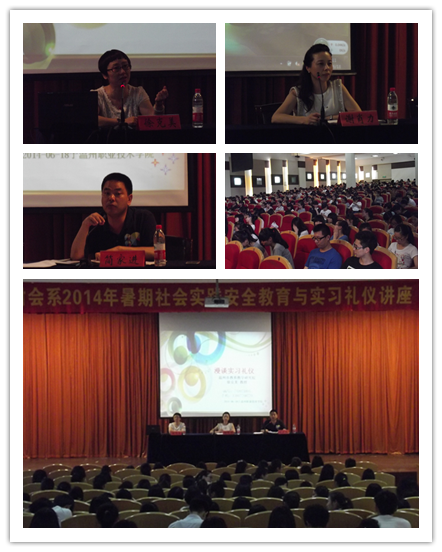 为了提高大学生暑期社会实践工作竞争力,为暑期社会实践作好充分准备。6月18日13:00在树人堂召开了“财会系2014年暑期社会实践安全教育与实习礼仪讲座”,此次讲座特邀温州市教育教学研究院徐克美教授分别为2012级和2013级学生解读了当代大学生在实习实践过程中应该注意的各种礼仪。财会系党总支书记谢肖力、副主任简家进出席了此次讲座。
