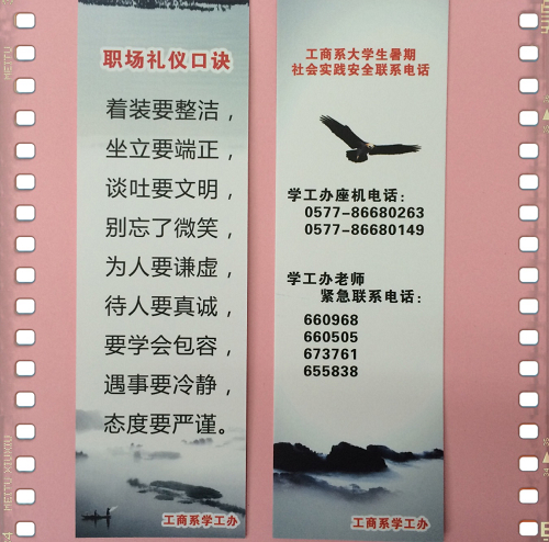 制定《工商系大学生暑期社会实践活动安全日报制度》《工商管理系大学生暑期社会实践安全须知》《工商系2014暑期实践告家长书》《工商管理系2014年大学生暑期社会实践活动紧急事件预案》等一系列文件规范安全工作,更贴心的制作安全书签发放给每一个学生,确保安全工作落实到每个学生。