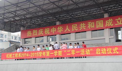 晨风拂面,催人奋进, 10月8日早7点,机械工程系在操场隆重举行2014/2015学年第一学期“二早一活动”启动仪式。系党总支书记黄加銮老师,学工办主任梅碎彬老师,学工办陈金菊老师、王丛思老师出席了仪式,全系同学精神抖擞地参加了此次活动,启动仪式由游彬彬同学主持。