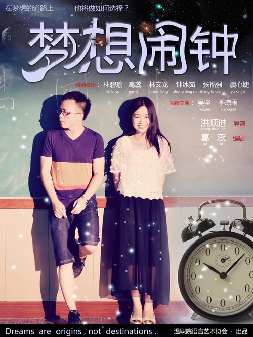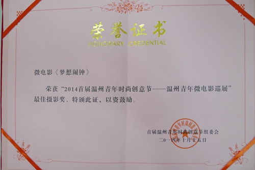 由中共温州市委宣传部、共青团温州市委主办的“2014年首届温州青年时尚创意节——温州青年微电影巡展”活动于日前刚刚落下帷幕的,由温州职业技术学院教职工语言艺术协会拍摄制作的微电影《梦想闹钟》荣获了最佳摄影奖的殊荣。