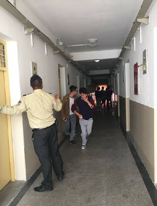 消防疏散演练现场,工作人员在楼内投放了演习专用烟雾弹,现场顿时浓烟滚滚,同时消防警报响起,消防演习正式开始。接到报警后,保卫处经济护卫队、学生处公寓辅导员、生活指导老师等相关人员第一时间到达现场,组织学生干部对楼内的同学从消防通道紧急撤离。在疏散过程中,同学们按照演练方案预先设定的路线,迅速、有序地从各个通道撤离,整个演练过程快速、安全、有序。