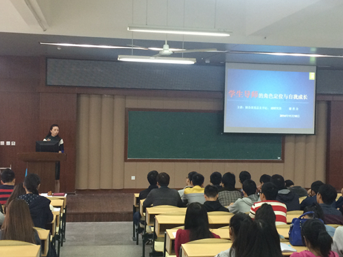 在随后的培训会上,谢肖力书记以《学生导师的角色定位与自我成长》为题做了专题讲座,谢书记以互动的形式与在场的学生导师们探讨了“教”与“导”的区别、“教师”与“学生导师”的区别、“学生导师”与“受众”的关系等话题,并给学生导师做了“体验教师角色,实施同伴互助”的角色定位;随后,谢书记结合真实案例,分别就如何编写导学计划、课前要做好哪些准备、如何有效实施导学活动和如何建设精品项目等做了详细讲解,为各系学生导师代表上了生动的一课。