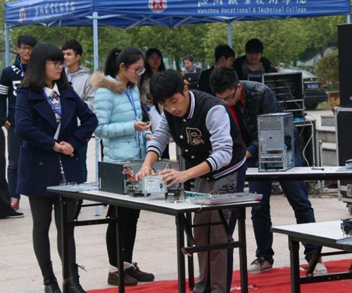 开幕式以一段活力四射的街舞表演开场。随后,童炳金书记致辞,他说,计算机网络目前已经成为大学生获取信息的最主要渠道,引导学生更好地使用互联网,营造健康文明和谐的网络文化环境,对充分发挥网络文化育人功能具有非常重要的意义,本次IT文化节暨网络文明月活动内容丰富,鼓励同学们积极报名参加。在本次开幕式中插入了现场技能比赛项目——装机大赛,通过前期初赛共有10名选手进入总决赛,比赛分两组进行,在紧张激烈的氛围下,同学们运用专业知识、娴熟的技术,快速进行机箱的组装,最终多媒体1402班雷通久同学以6分10秒夺得此次装机大赛的冠军。