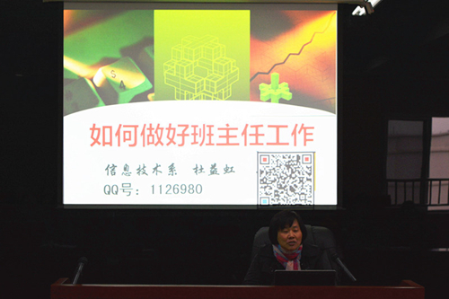 为了进一步加强师德风建设,提高班主任工作水平,有效的管理班级,提升班级凝聚力,畅通各系班主任互相交流、互相学习的渠道,12月3日下午,财会系邀请信息技术系优秀班主任杜益虹在教师发展中心做经验报告,两系班主任及辅导员参加了本次会议,会议由财会系党总支书记谢肖力主持。