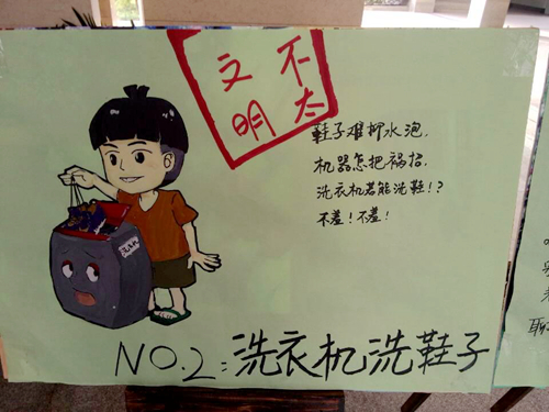 自11月26日起,在人文传播系一楼大厅展出漫画版“寝室十大不文明现象”,具体包括:一、漱口时不低头,溅到别人。二、洗衣机洗鞋子。三、上完厕所不冲。四、把垃圾留在浴室储物柜内。五、随地吐痰。六、乱扔垃圾。七、不顾他人等待,长时间洗澡。八、用力关门。九、寝室走廊大声喧哗讲电话。十、在寝室楼内吸烟。