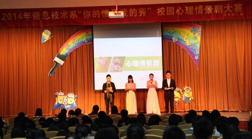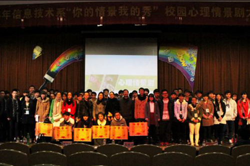 为塑造大学生健康,积极向上的品格,引导同学们积极思考,认真面对, 12月22日晚18:00,信息技术系在树人堂举办了“你的情景 我的show”第三届心理情景剧大赛。信息技术系大一学生和班主任参与了此次活动,系党总支书记童炳金、学工办主任罗小阳、辅导员李文静、系辅导员李小琦担任此次大赛评委老师。
