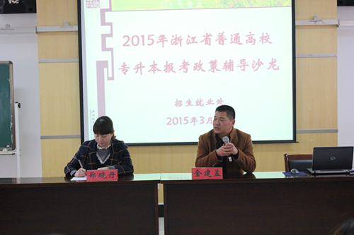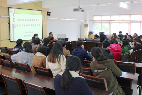 然后,招生就业处郑晓丹老师就《浙江省2015年选拔优秀高职高专毕业生进入本科学习工作实施细则》中的报考条件、考试科类和录取类别、报名与填报志愿流程、注意事项等方面进行解析,并和同学进行交流答疑。