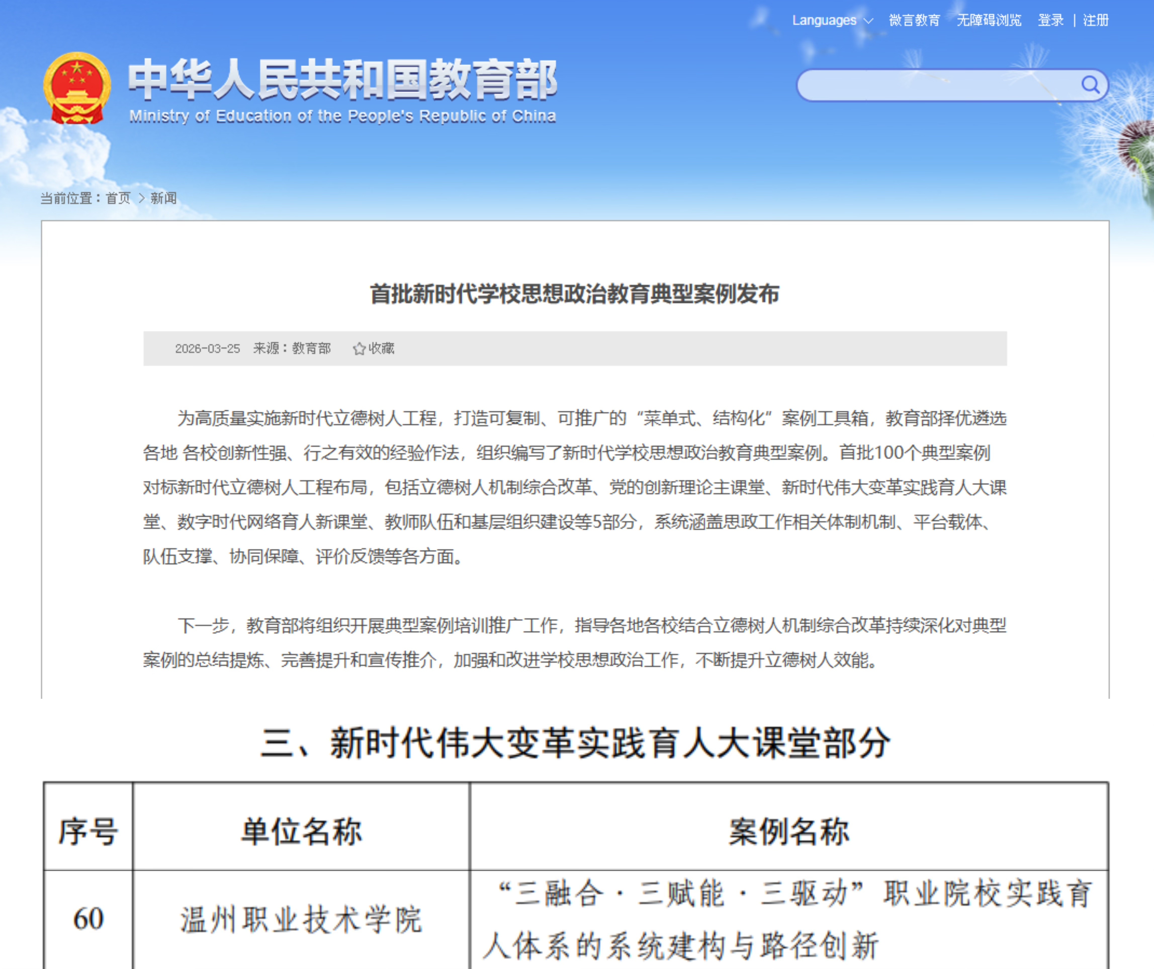 3月25日,教育部发布首批新时代学校思想政治教育典型案例。温职院《“三融合·三赋能·三驱动”职业院校实践育人体系的系统建构与路径创新》成功入选,是浙江省唯一入选的高职院校。据悉,全国仅5所高职院校上榜。